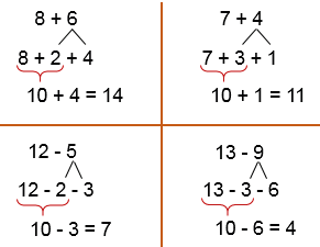| 8 + 6 | 7 + 4 | 12 - 5 | 13 - 9 |