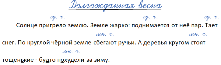 Солнце пригрело (ед. ч.) землю. Земле жарко: поднимается (ед. ч.) от неё пар. Тает (ед. ч.) снег. По круглой чёрной земле сбегают (мн. ч.) ручьи. А деревья кругом стоят (мн. ч.) тощенькие - будто похудели (мн. ч.) за зиму.