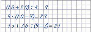 | (16 + 20) : 4 = 9 1) 16 + 20 = 36 2) 36 : 4 = 9 | 9 • (10 - 7) = 27 1) 10 - 7 = 3 2) 9 • 3 = 27 |