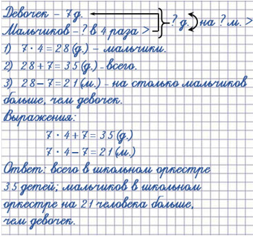 4. В школьном оркестре 7 девочек, а мальчиков в 4 раза больше, чем девочек. Сколько всего детей в школьном оркестре? На сколько больше мальчиков в этом оркестре, чем девочек?