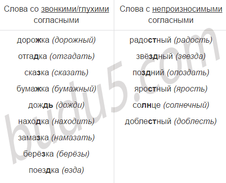 Распредели слова в две группы в зависимости от того, какая в слове орфограмма: в первую - слова с глухими и звонкими согласными, во вторую - слова с непроизносимыми согласными.