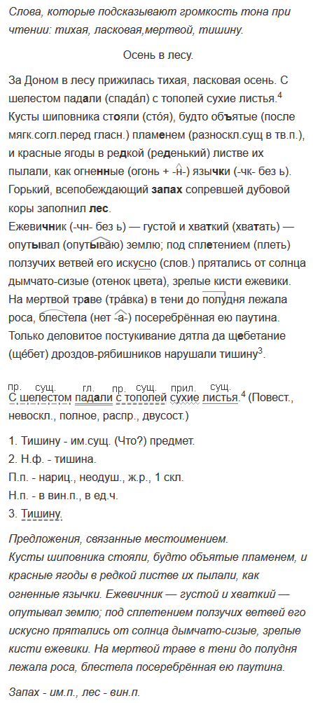 За Доном в лесу прижилась тихая, ласковая осень. С шелестом пад..ли с тополей сухие листья.4 Кусты шиповника ст..яли, будто об..ятые плам..нем, и красные ягоды в ре..кой листве их пылали, как огне(н, нн)ые языч(?)ки. Горький, всепобеждающий запах сопревшей дубовой коры заполнил лес. Ежевич(?)ник — густой и хва..кий — опут..вал землю; под спл..тением ползучих ветвей его искус(?)но прятались от солнца (дымчато)сизые, зрелые кисти ежевики. На мертвой тр..ве в тени до (полу)дня лежала роса, бл..стела посеребрённая ею паутина. Только деловитое постукивание дятла да щебетание дроздов-рябишников нарушали тишину3.