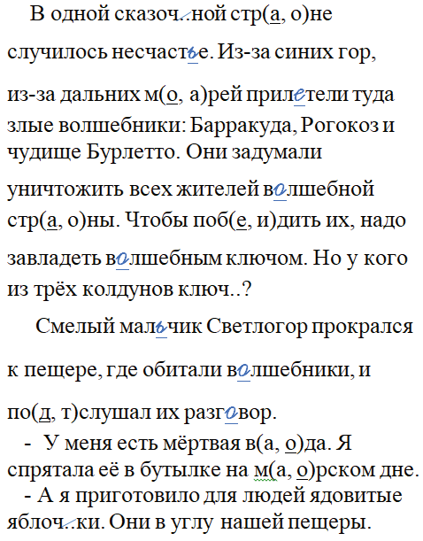 В одной сказоч..ной стр(а, о)не случилось несчаст..е. Из-за синих гор, из-за дальних м(о, а)рей прил..тели туда злые волшебники: Барракуда, Рогокоз и чудище Бурлетто. Они задумали уничтожить всех жителей в..лшебной стр(а, о)ны. Чтобы поб(е, и)дить их, надо завладеть в..лшебным ключом. Но у кого из трёх колдунов ключ..?