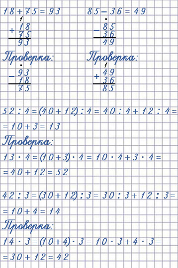 | 18 + 75 = 93 Проверка 93 - 18 = 75 или 93 - 75 = 18 | 28 • 3 = 84 Проверка 84 : 3 = 28 или 84 : 28 = 3 |