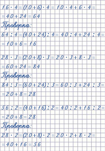 | 16 • 4 = (10 + 6) • 4 = 40 + 24 = 64 | 28 • 3 = (20 + 8) • 3 = 60 + 24 = 84 |