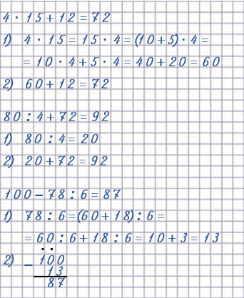 | 4 • 15 + 12 = 60 + 12 = 72 | 96 : 8 + 59 = 12 + 59 = 71 |