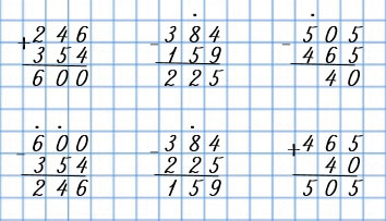 | 246 + 354 | 384 - 159 | 505 - 465 |