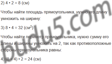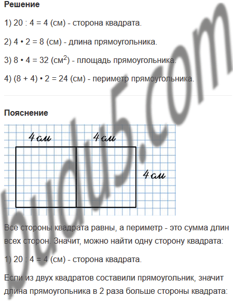55. Периметр квадрата равен 20 см. Из двух таких квадратов составили прямоугольник. Найди периметр и площадь этого прямоугольника.