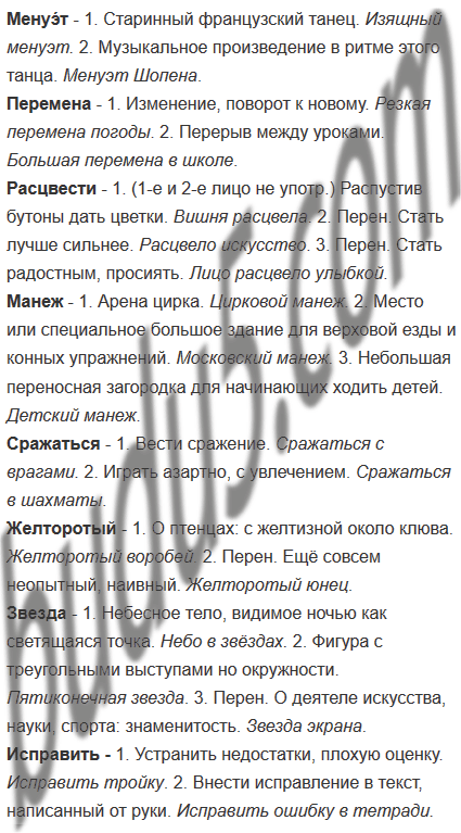 1. Попробуйте доказать, что слова менуэ́т, перемена, расцвести, манеж, сражаться, желторотый, звезда, исправить являются многозначными. Выполняя это задание, обращайтесь к толковому словарику учебника.