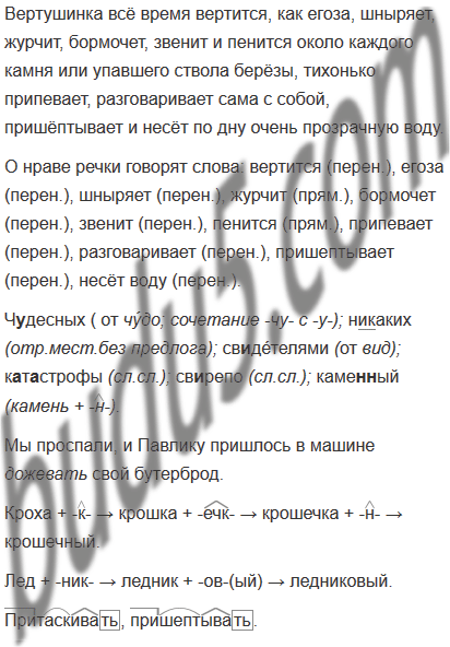 1. Выразительно прочитайте текст. Найдите описание речки и запишите его. С помощью каких слов автор передаёт беспокойный нрав маленькой реки? Установите, в прямом или переносном значении употреблены эти слова.