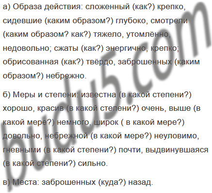 а) образа действия; б) меры и степени; в) места. К наречию ставьте вопросы, пользуясь таблицей на с. 86.