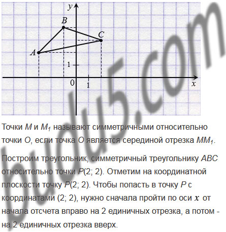 1; 4), С(2;3). Постройте треугольник, симметричный данному относительно: 1) начала координат; 2) точки Р(2; 2). Найдите координаты вершин полученного треугольника.