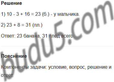 Задание № 6. Мальчик попал на необитаемый остров. С первой пальмы он сорвал 10 бананов, но 3 банана у него отняла обезьяна. Со второй пальмы он сорвал 16 бананов. А ещё он нашёл 8 кокосовых орехов. Сколько у него теперь бананов? Сколько всего плодов?