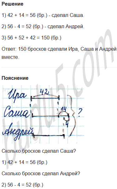 Задание № 6. На тренировке по баскетболу Ира сделала 42 броска по кольцу, Саша - на 14 бросков больше, чем Ира, а Андрей - на 4 броска меньше, чем Саша. Сколько всего бросков по кольцу сделали Ира, Саша и Андрей вместе?