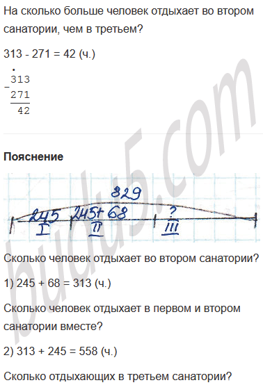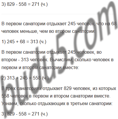 Задание № 6. В трёх санаториях отдыхает 829 человек. В первом санатории отдыхает 245 человек. Это на 68 человек меньше, чем во втором санатории. Сколько отдыхающих в третьем санатории? Поставь другие вопросы к этому условию и ответь на них.