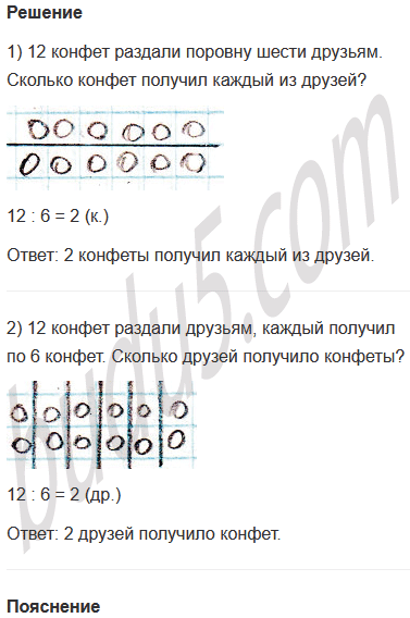 Задание № 5. Придумай две различные по смысле задачи на деление, которые решаются так: 12 : 6 = 2. Сделай рисунки.