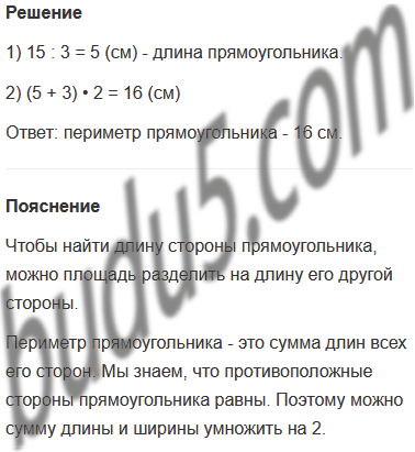 Задание № 7. Площадь прямоугольника равна 15 см2, а ширина - 3 см. Найди периметр этого прямоугольника.
