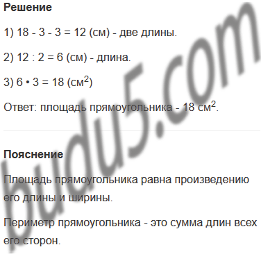 Задание № 8. Периметр прямоугольника равен 1 дм 8 см, а ширина - 3 см. Чему равна его площадь?