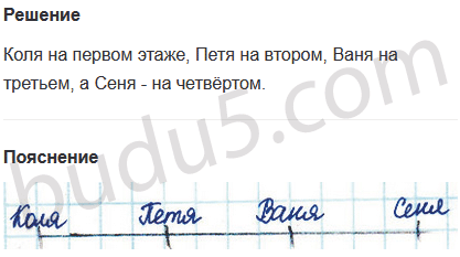 Задание № 14. Четыре друга, Ваня, Петя, Сеня и Коля, живут в четырёхэтажном доме на разных этажах. Ваня живёт выше Пети, но ниже Сени, а Коля живёт ниже Пети. На каком этаже живёт каждый из них?