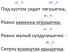 Под кустом (м. р.) сидит лягушечка (ж. р.),