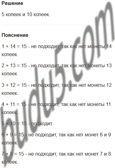 Задание № 107. У меня две монеты. В сумме они составляют 15 копеек. Одна из моих монет не 5 копеек. Какие это монеты?