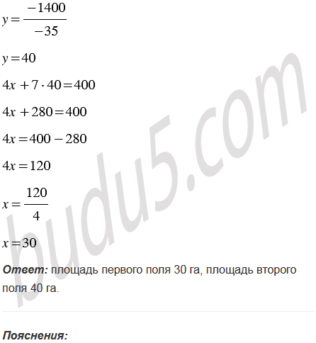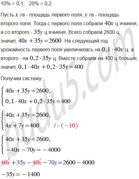 С одного поля собрали по 40 ц ячменя с гектара, а с другого - по 35 ц с гектара. Всего собрали 2600 ц. На следующий год урожайность первого поля увеличилась на 10%, второго - на 20%, а в результате вместе собрали на 400 ц больше. Найдите площадь каждого поля.