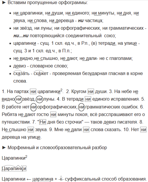 1. На партах (ни)царапинк2...  2. Кругом (ни)души. 3. На небе (не)видно (ни)звёзд, (ни)луны. 4. В тетрад.. (ни)единого исправления. 5. В работе нет (ни)орфографических, (ни)грамматических ошибок. 6. Ребята (не)дают гостю (ни)минуты покоя, всё расспрашивают его о путешествии. 7. «(Ни)дня без строчки» — таков д..виз писателя. 8. (Не)слышно (ни)звука. 9. Мне (не)дали (ни)слова сказать. 10. Нет (ни)деревца на улиц...