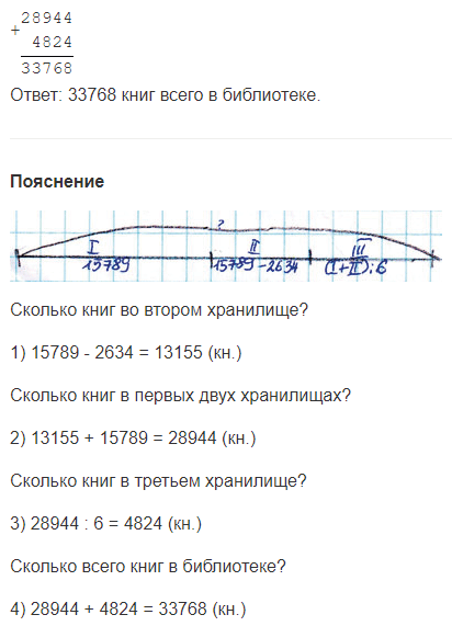 Задание № 5. В библиотеке три хранилища. В первом хранилище 15789 книг, во втором на 2634 книги меньше, чем в первом, а в третьем в 6 раз меньше, чем в первых двух хранилищах вместе. Сколько всего книг в библиотеке?