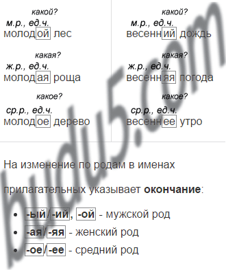 Окончания имён прилагательных: м. р. - ой, ий, ый; ж. р. - ая, яя; ср. р. - ое, ее.