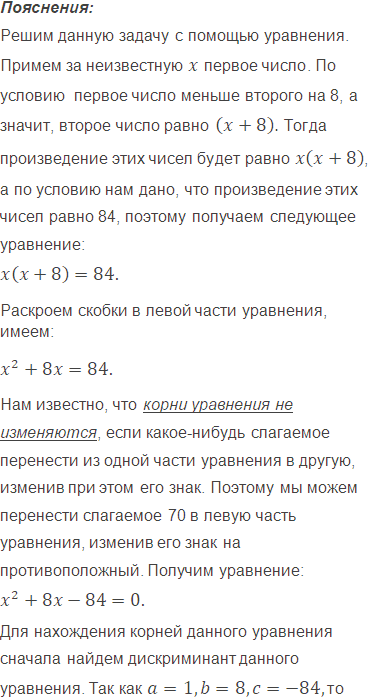 Произведение двух чисел равно 84. Найдите эти числа, если одно из них на 8 меньше другого.