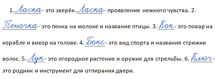 1. __ - это зверёк. __ - проявление нежного чувства. 2. ______- это пенка на молоке и название птицы. 3. __ - это повар на корабле и вихор на голове. 4. _____ - это вид спорта и название стрижки волос. 5. _____ - это огородное растение и оружие для стрельбы. 6. _____ - это родник и инструмент для отпирания двери.
