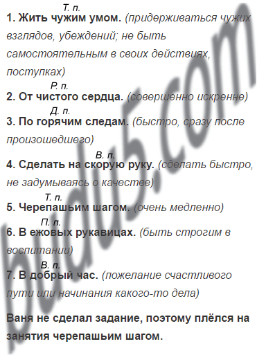 1. Жить чужим умом. 2. От чистого сердца. 3. По горячим следам. 4. Сделать на скорую руку. 5. Черепашьим шагом. 6. В ежовых рукавицах. 7. В добрый час.
