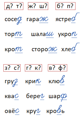 Подбери проверочные слова, где после сомнительного согласного будет стоять гласный звук.