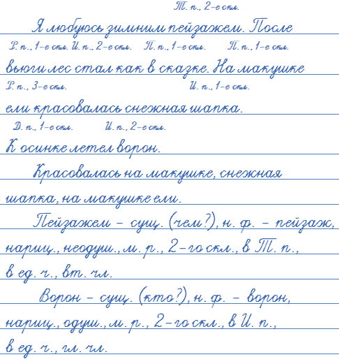 Я любуюсь зимним пейзаж..м3. После вьюг.. лес стал как в сказк.. . На макушк.. ел.. красовалась снежная шапка. К осинк.. летел ворон3.