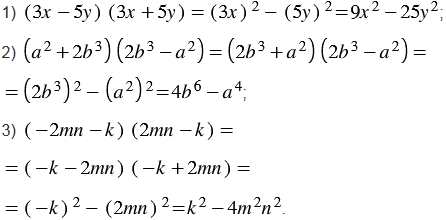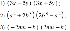 | Разность квадратов двух выражений равна произведению разности этих выражений и их суммы. |